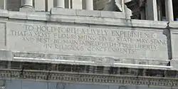 Clarke wrote a particularly eloquent proposal in a petition received by the crown on 5 February 1661, with certain words emboldened within the document. His earnest request was "TO HOLD FORTH A LIVELY EXPERIMENT THAT A MOST FLOURISHING CIVILL STATE MAY STAND ... AND BEST BE MAINTAYNED ... WITH A FULL LIBERTIE IN RELIGIOUS CONCERNMENTS". These words became emblematic of Rhode Island's struggle for religious freedom and were soon included in the charter itself—and much later were chiseled on the frieze of the Rhode Island State House.[62] One of the later petitions dealt heavily with the boundary issues between the Rhode Island and Connecticut colonies. Clarke had to wait nearly a year for any action on the various petitions.[63]