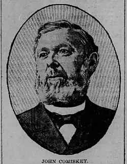 John Comiskey was born in Crosserlough, County Cavan, Ireland, in 1826, and in 1848 moved to New Haven, Connecticut in the United States,[2] where he joined the lumber trade. In 1853 he relocated to Chicago, Illinois, where he oversaw the incoming freight on the Chicago, Rock Island and Pacific Railroad. In 1863, he was hired by Shufeldt & Croskey, the prominent distillers. He later worked as superintendent of shipments at a cattle yard in Fort Wayne, Indiana.