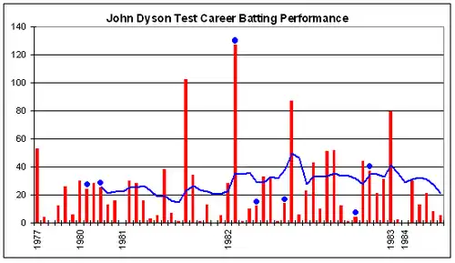 Dyson scored 1028 first class runs that summer at 57.11. He was second in the highest Sheffield Shield run scorers in that season, with 815 runs at 90.56 – only Greg Chappell amassed more.[41] In February 1981 Ian Chappell left out Dyson from Chappell's hypothetical test squad to England "because he seems to have a mental barrier about making big scores in test cricket."[42] However Dyson was selected on the tour.