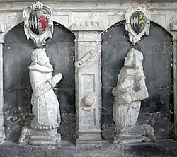 Kneeling effigies of (the future Col.) John Giffard aged 23, (right) opposite his father, Arthur Giffard (died 1616), (left) who kneels at a prie dieu. Detail from base of 1625 Giffard monument in Chittlehampton Church[b]