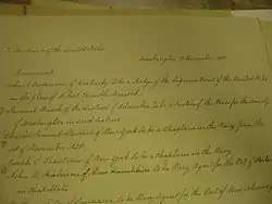 Crittenden's support of a new election was both popular and politically expedient. When the U.S. Senate term of Martin D. Hardin, one of Slaughter's unpopular nominees, expired in 1817, the Kentucky General Assembly chose Crittenden to fill the vacancy.[22] Though he was the youngest member of the body, he served as the second-ever chairman of the newly created Committee on the Judiciary.[5][23] He was also a member of the Committee on Naval Affairs.[22] During his term, he introduced legislation to reimburse and indemnify persons who were fined under the 1798 Sedition Act.[23] He found state politics more interesting, however, and this fact, coupled with increased financial responsibilities incurred by the birth of his third and fourth children, prompted his decision to resign his seat on March 3, 1819.[24][25]