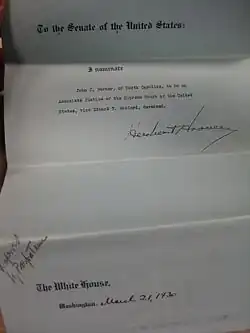 On March 21, 1930, Parker was nominated by President Herbert Hoover as an Associate Justice of the United States Supreme Court[4] to fill the vacancy caused by the death of Edward Terry Sanford.[2] His confirmation was opposed by the American Federation of Labor (AFL) and National Association for the Advancement of Colored People (NAACP)[5] during confirmation hearings before the Senate Judiciary Committee. AFL president William Green[6] specifically faulted Parker for a 1926 Fourth Circuit Court decision which he authored regarding the United Mine Workers, involving antitrust law and yellow-dog contracts.[2] The NAACP joined the opposition in response to remarks Parker had made while a candidate for governor in 1920 about the participation of African Americans in the political process: