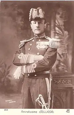 Admiral of the Fleet John Rushworth Jellicoe, 1st Earl Jellicoe, GCB, OM, GCVO, SGM, DL (5 December 1859 – 20 November 1935)[1] was a Royal Navy officer. He fought in the Anglo-Egyptian War and the Boxer Rebellion and commanded the Grand Fleet at the Battle of Jutland in May 1916 during the First World War. His handling of the fleet at that battle was controversial. Jellicoe made no serious mistakes and the German High Seas Fleet retreated to port, at a time when defeat would have been catastrophic for Britain, but the public was disappointed that the Royal Navy had not won a more dramatic victory given that they outnumbered the enemy. Jellicoe later served as First Sea Lord, overseeing the expansion of the Naval Staff at the Admiralty and the introduction of convoys, but was relieved at the end of 1917. He also served as the governor-general of New Zealand in the early 1920s.