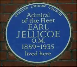 Jellicoe was promoted to Admiral of the Fleet on 3 April 1919.[41] He became Governor-General of New Zealand in September 1920[42] and while there also served as Grand Master of New Zealand's Masonic Grand Lodge.[43] Following his return to England, he was created Earl Jellicoe and Viscount Brocas of Southampton in the County of Southampton on 1 July 1925.[44] He also served as the Commissioner for London Boy Scouts from 1925 to 1928.[45] He was made a Deputy Lieutenant of Hampshire in 1932.[46] He died of pneumonia at his home in Kensington in London on 20 November 1935 and was buried in St Paul's Cathedral.[29]