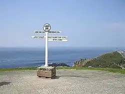 • Land's End is the traditionally acknowledged extreme western point of mainland England. It is in western Cornwall at the end of the Penwith peninsula. The O. S. Grid reference of the road end is SW342250, Postcode TR19 7AA. In fact it, or strictly speaking Dr Syntax's Head, SW341253, a few hundred yards NW of the road end, is mainland England's most westerly point.[1] The most southerly point is Lizard Point, about 9 miles (14 km) further south. Land's End is sometimes reckoned incorrectly as mainland Great Britain's most southwesterly point. This accolade belongs to Gwennap Head, SW365215, which is at least 2 miles (3.2 km) further south than Dr Syntax's Head but only about 1.5 miles (2.4 km) less west.[2]