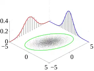 Many sample observations (black) are shown from a joint probability distribution. The marginal densities are shown as well (in blue and in red).