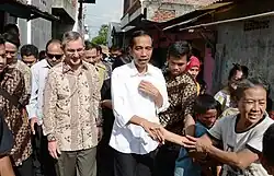 With incumbent president Susilo Bambang Yudhoyono hitting term limits in 2014, Jokowi was seen as a major contender for the position due to his popularity and he topped initial polls.[8] Initially, Jokowi himself did not directly respond to media inquiries regarding his possible candidacy.[5][9] During his governorship, his blusukan (impromptu visits) habit which he started doing during his mayoral term, became a center of attention outside his programs.[10]