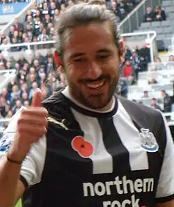 Gutiérrez scored his first goal for Newcastle United in their pre-season friendly match against Darlington, which resulted in a 7–2 win for Newcastle. on 18 July 2009.[12] Following the departure of left-sided winger Damien Duff, he switched from his usual right winger to left winger position, forming an effective left flank partnership with fellow Spanish-speaker José Enrique.[13] His first competitive goal for Newcastle was against Peterborough United on 7 November 2009, taking on five players before scoring.[14] He netted his second goal of the season in the 6–1 drubbing of Barnsley, smashing a right-footed shot into the net via the underside of the crossbar from 25 yards, and celebrating with his trademark Spider-Man mask.[13] The next came at Bristol City, where he punished a defensive error to spark Newcastle's comeback from two goals down to draw 2–2.[15] Following Newcastle's promotion to the Premier League, Gutiérrez stated that he would like to play at Newcastle for many more years.[16] In 2010, World Footballer of the Year, Lionel Messi, lauded Gutiérrez as one of the finest players in the Premier League.[17]