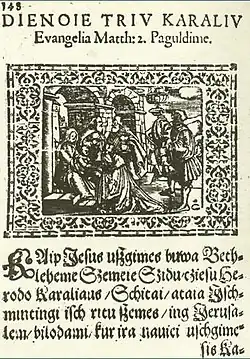 After living twenty-five meager years in Labiau, Bretke (Jonas Bretkūnas) applied for a position as pastor at another Prussian town, but was in 1587 transferred to a Lithuanian language parish in Königsberg as pastor.[2] He continued with his translation of the Bible and other scholarly works. In 1589, he published several new works, in particular "Giesmes duchaunos" (Spiritual Hymns), based on Martynas Mažvydas' works, as well as a small collection of hymns called "Kancionalas netukriu giesmiu", and a prayer book translation from German into Lithuanian "Kollectas", all printed by Georg Osterberg of Königsberg.