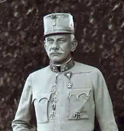 At the beginning of the World War I, he was given command of the 3rd Infantry Troops Division of the XIV Corps on August 5, 1914, and then on October 1, 1914, of the XIV Corps.[1][2] After an army group with eight Austrian infantry troop divisions, three Austrian cavalry troop divisions, one German infantry division and three Polish legions had been formed shortly after the outbreak of war, he was given command of this army group which was known as Roth. At the Battle of Limanowa, he succeeded in preventing the Russian forces from breaking through between the 4th and 3rd Imperial and Royal Army and the threatening encirclement of Kraków to fend off at.[1]