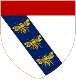 Argent on a Bend Azure three Bees volant Or a Chief Gules