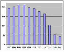 The impact of Tkach's tenure as the head of the WCG was notable. Church income dropped from a high of over $200 million in 1990 to $50 million by 1996.[37] By then the church could only count 49,000 as members, less than half from its peak.[2] The circulation of The Plain Truth, distributed free by subscription and via newsstand distribution around the globe, fell from a peak of 8,000,000 to less than 100,000 before it switched to a paid subscription status. Eventually the magazine was spun off into a separate, independent, evangelical ministry.[38] The number of employees at the church headquarters fell from 1,000 to about 50. Ambassador University, as the college had become after earning regional accreditation in Texas, ceased operations in 1997 as the church could no longer provide its annual operating subsidy. The Pasadena campus was finally sold in 2004.[3]