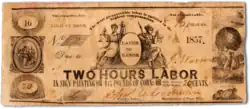 Original 1857 labor note circulated as currency in Josiah Warren's equitable exchange system in Modern Times, New York.[35]
