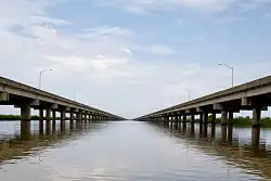 The Jubilee Parkway is a pair of parallel concrete viaduct bridges that carry Interstate 10 across Mobile Bay from the George Wallace Tunnel on Blakeley Island in Mobile, Alabama eastbound to Spanish Fort/Daphne, Alabama. The bridges are similar in design to the pre-Hurricane Katrina I-10 Twin Span Bridge near New Orleans, Louisiana. Each of the two bridges is two lanes wide, for a total of four lanes, and 7.5 miles (12.1 km) long. The parkway was completed in 1978[1] and crosses the northern portion of Mobile Bay, running roughly parallel to the nearby Battleship Parkway,[2] with which it has an interchange. It was named for the jubilee phenomenon that occurs intermittently in Mobile Bay, but is commonly referred to locally and in the media as the "Bayway".[3]