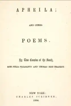 Creswell's cousin, Thomas Bibb Bradley (1829-1855),[8] a poet of promise, who died soon afterward, induced her to publish a selection of her poems with some of his own. The volume appeared in 1854, before her marriage, under the title Apheila, and other Poems, by two Cousins of the South (New York City, 1854).[3][8]