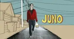 Juno's opening title sequence, depicting a rotoscoped Juno walking through her town while drinking a bottle of SunnyD orange drink, was put together over 7–8 months[36] by a small design studio, Shadowplay Studio, based in Los Angeles.[57] Reitman had met the studio's co-founder Gareth Smith in Japan on the short film festival circuit where they each had shorts screening.[57] Shadowplay created the opening title sequence for Reitman's previous film, Thank You for Smoking, and he contacted them again when he found out he was going to direct Juno.[58] With vintage 1970s punk-rock posters as inspiration, Smith and artist Jenny Lee decided to create a sequence that "had texture and a little bit of edge, but also imparted the warmth and heart of the screenplay".[59] In the last days of filming in Vancouver,[59] Page was photographed with a high speed camera from a number of angles walking on a treadmill and drinking SunnyD.[57] 900 still images of a walking and drinking Page were printed out and repeatedly run through a Xerox machine to degrade their quality until the pictures appeared hand-drawn.[58] The pictures were cut out and scanned back onto the computer, then layered onto the background drawn by Lee with compositing software[57] to create a stop motion animation sequence that corresponded to "All I Want Is You" by Barry Louis Polisar, the song Reitman had chosen.[47] Shadowplay also designed the titlecards for each of the seasons for the film,[36] hand-made a custom typeface for the opening title sequence and the closing credits, and collaborated on the design of the soundtrack and the DVD.[59]