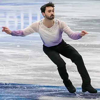 On the Grand Prix, Aymoz competed first at the 2019 Internationaux de France, where a fall on his combination attempt in the short program left him in third place, distantly behind Nathan Chen and Alexander Samarin but only a few points ahead of Shoma Uno.[13] He placed second in the free skate, behind Chen, winning the bronze medal overall.[14] Aymoz then continued this successful streak by winning silver at the following NHK Trophy and thereby qualifying for the Grand Prix Final. He was second in the short program behind Yuzuru Hanyu, making only a small error on his quad toe loop, and third in the free skate behind Hanyu and Roman Sadovsky.[15][16] Competing at the Final, Aymoz placed third in the short program, skating cleanly despite a musical mishap that initially played the music of competitor Dmitri Aliev.[17] Third in the free skate as well with only one error with a fall on an underrotated quad toe, he won the bronze medal, the first Frenchman to medal at the Final since Brian Joubert in 2006.[18]