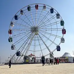 Located in the recreation area, the ferris wheel's height is 30 meters. It is 1,136 meters above sea level. There are 20 closed highly comfortable and safe cabins, 6 passengers for each cabin. There is great view on Almaty from cabins.[7]