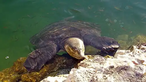 Nile turtle near mud bath on the Dalyan river. Photo: Maria Jonker