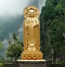 During the reign of Emperor Ming of Han, Buddhism started to flourish, reaching its peak in the Tang and eventually spreading to Korea. At the time, monks and scholars arrived from those countries to seek the dharma in China. One of these pilgrims was a former prince from Silla named Kim Gyo-gak, who became a monk under the Chinese name Dizang "Kṣitigarbha," pronounced Jijang in Korean.[10] He went to Mount Jiuhua in present-day Anhui. After ascending, he decided to build a hut in a deep mountain area so that he could cultivate the dharma.