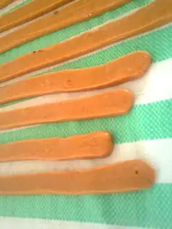 The mixture is then heated to a very high temperature in large woks over fires generated by the burning of coconut shells. While being heated, the mixture is stirred continuously to ensure even heat distribution. Traditionally, this stirring process was done manually with large wooden paddles. In larger modern manufacturing facilities, these paddles have been replaced by electric motors. The mixture eventually caramelises to a thicker texture. Recognising when the mixture has been cooked to the right level is more of an art than an exact science. While it is still hot and soft, the thickened mixture is then stringed out into moulds and allowed to cool. The final step sees the candy strings cut into rectangular lozenges, then wrapped and packaged.