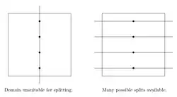 It is important to take care in the domain and element chosen to split page by, since it is desirable to try to balance the number of points on either side of the splitting plane. In some cases, a poor choice of splitting domain can result in undesirable splits. It is also possible that a page cannot be split by a certain domain.