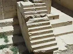 In the following years, Ferdinand Justi, Ghirshman, Schmidt and some others supported the hypothesis of Ka'ba-ye Zartosht being a fireplace. One of the reasons of this group is that Darius I says in the Behistun Inscription (First column, 63): "...I rebuilt the temples that Gaumata had destroyed. I returned the pastures, flocks, slaves and houses that Gaumata had taken to the people..."[17] Thus, there were some "temples" in the periods of Cyrus II and Cambyses II that Gaumata destroyed and Darius rebuilt them the same way; and since "Solomon's Prison" in Pasargadae is belonging to the first Achaemenid era and destroyed, and its exact copy was built in Naqsh-e Rustam in Darius's period, it should be concluded that those two structures are the mentioned temples in the Behistun Inscription; and since any temple in Persia during Darius's period could not be anything other than the holy fire, those were all fireplaces;[2] besides, Ka'ba-ye Zartosht has been conserved well even after the Achaemenid era and was not surrounded by soil and stones; and in the beginning of the Sasanian era, Shapur I composed the most important document of the Sasanian history on it and Kartir wrote a religious document on it. These show that the structure was religiously important. On the other hand, a structure is drawn on the coins of some Persian kings like those of Otophradates I that is a fireplace and the royal fire was kept above or inside it; and since the structure has a two-stair platform and its two doors are like Ka'ba-ye Zartosht and the center of the Persian kingdom was also in the city of Istakhr, it is the very Ka'ba-ye Zartosht that is drawn on their coins; and on the ceiling of this structure are put three fireboxes and the Persian king is standing in a praying posture in front of it.[2][18]