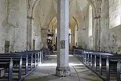 Of the interior, murals, the font and a wooden sculpture of St. Simon of Cyrene are all medieval. A large set of finely carved late Gothic wooden sculptures, at least some of which were possibly made by Lübeck master carver Henning von der Heide, were originally also displayed in the church but are today housed in Saaremaa Museum in Kuressaare Castle. Additionally, the pillars of the church are decorated with stone carvings from the 15th century, displaying a plain, primitive and evocative style that is clearly related to stone carving from the same time from Padise Abbey and the medieval Dominican cloister in Tallinn. The pulpit (1645) and the neo-Gothic altarpiece decorated by Otto Friedrich Theodor von Möller are later, also noteworthy interior details.[5]