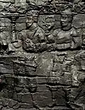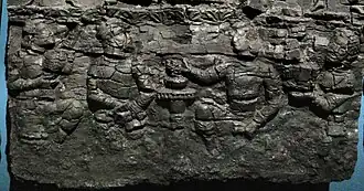 The worshippers are dressed in knee-length tunics and long boots worn over trousers - a clothing style reminiscent of that depicted in the Penjikent murals - and wear shoulder ribbons of the type associated with Hephthalite nobility.[9] The gate is dated to the first half of the 6th century CE (500-550 CE), and the destruction of the palace is attributed to the Islamic conquest of Samarkand in 712 CE. By a happy chance, the partial carbonising of the low-relief carvings has served to help in their preservation, when the aim of those who attempted to burn them was undoubtedly their destruction ( which would been achieved had they been reduced to ash, rather than effectively converted to charcoal).[9][11]