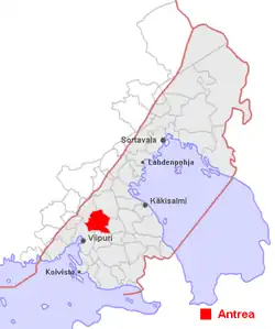 Location of Antrea in Finland between 1869 and 1940. The area transferred to the Soviet Union after the Winter War is shown in grey.