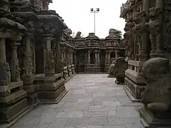 The temple complex is complete in all respects as it has garbagriha (sanctum sanctorum), antarala (inner enclosure), mandapa, a high compound wall, and an entrance gate, the gopuram.[13] The mandapa, which was initially detached, was made part of the main shrine by interposing an ardhamantapa (smaller hall). The pillars of the mandapa have the repetitive features of mythical lion mounts.