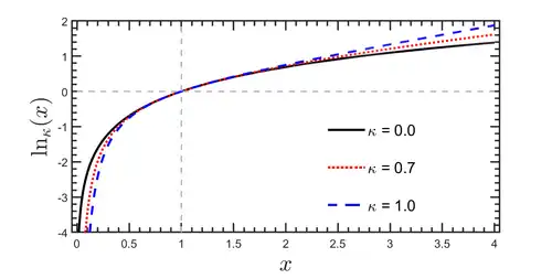 {\displaystyle \ln _{\kappa }(x)={\begin{cases}{\frac {x^{\kappa }-x^{-\kappa }}{2\kappa }}&{\text{if }}0<\kappa <1,\\[8pt]\ln(x)&{\text{if }}\kappa =0,\\[8pt]\end{cases}}}