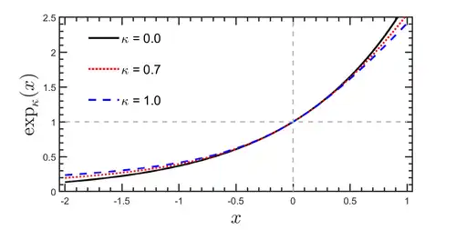 {\displaystyle \exp _{\kappa }(x)={\begin{cases}{\Big (}{\sqrt {1+\kappa ^{2}x^{2}}}+\kappa x{\Big )}^{\frac {1}{\kappa }}&{\text{if }}0<\kappa <1.\\[6pt]\exp(x)&{\text{if }}\kappa =0,\\[8pt]\end{cases}}}
