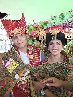![]() A newly-married Karonese couple dressed in Karo traditional outfit (2010), the wedding ceremony called as Erdemu Bayu in local Karonese language. | |