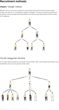 Two infographs depicting the ranks within the Katipunan and the Triangle system of recruitment.