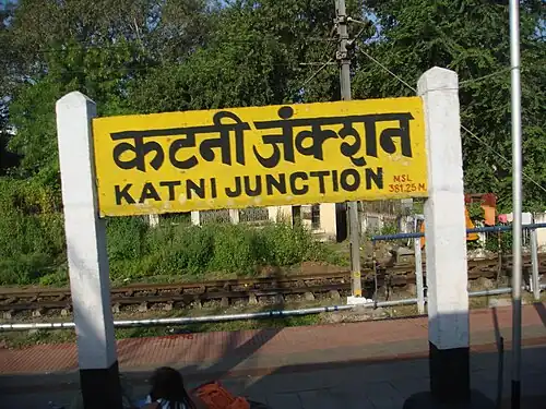Katni Junction (Station Code: KTE)[2] is a major rail junction in Katni, India. Rail links from the junction travel in five directions – Bina, Jabalpur, Satna, Bilaspur, Singrauli. Rail links from the junction travel to New Delhi, Mumbai, Vadodara, Howrah, Chennai, Bangalore, Dhanbad, Prayagraj, Kanpur, Lucknow, Bhopal, Indore, Gwalior, Agra, Gorakhpur, Muzaffarpur, Patna, Chandigarh, Ludhiana, Ambala, Bathinda, Jaipur, Jodhpur, Ajmer, Nagpur, Pune, Jammu, Raipur, Bhubaneswar, Visakhapatnam, Hyderabad, Hubli, Madurai, Vasco, Rameshvaram, Kanyakumari, Ernakulam and other Indian cities. To reduce the junction's load the new Katni Murwara & Katni South has been opened to carry trains from Bina and Jabalpur respectively.[3][4][5]