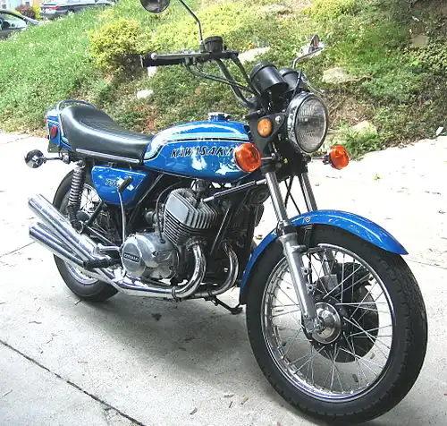 The Kawasaki triples were a range of 250 to 750 cc (15 to 46 cu in) motorcycles made by Kawasaki from 1968 to 1980. The engines were air-cooled, three-cylinder, piston-controlled inlet port two-strokes with two exhaust pipes exiting on the right side of the bike, and one on the left. It was the first production street motorcycle with capacitor discharge ignition (CDI). Right from the first triple model, the 1968 Mach III H1 500 cc, it was a sales success that gained a reputation for almost unmatched acceleration as well as an air of danger for inexperienced riders trying to cope with the bike's increased power to weight ratio over any previously available stock motorcycles.[1]