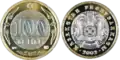 ₸100 | 24.5 mm | 6.65 g | 1.95 mm | Inner disk: alloy of "nickel silver", white color Outer disk: alloy of "nibrass", yellow color. |