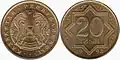 ₸20 | 18.27 mm | 2.9 g | 1.6 mm | Carbon steel and galvanic nickel | Grooved | Value | Year, Emblem of Kazakhstan | 2019~present | 26 April 2019 | Current | ||||
