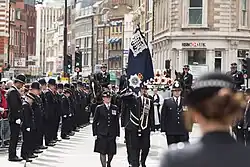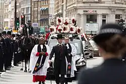 The following day, on 10 April, Palmer's coffin travelled in procession to Southwark Cathedral,[13] escorted by motorcycle outriders from the Special Escort Group of the Metropolitan Police. The route was 2.6 miles (4.2 km) long and avoided Westminster Bridge where the terrorist attack had begun.[14] Instead, the procession crossed the Thames over Lambeth Bridge, during which a ten-second horn salute was given by boats on the river.[13] Tens of thousands of people lined the streets, including 5,000 police officers.[13] The procession was fronted by a colour party carrying the Metropolitan Police Service Standard, who were followed by five mounted police officers.[14] Then came the funeral conductor and chaplains (including Rose Hudson-Wilkin, Chaplain to the Speaker of the House of Commons) who were walking in front of the hearse. The hearse carried Palmer's coffin which was draped in the police flag, and there were "red and white floral tributes atop the hearse"; these "spelled out 'No 1 Daddy', 'husband', 'son', 'brother', 'uncle' and 'Keith'".[14] Making up the rear were cars carrying his family, and four more mounted officers.[13]