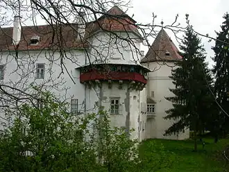 The castle has a square-shaped plan, courtyard and corner towers, two larger and two smaller. Several windows have frames in Renaissance style. Built above the entrance is a picturesque stone balcony on consoles. The consoles can be seen at the floors of the towers. The entrance is on the north side, on a bridge over the outside ditch of the castle. Old documents show that the former citadel (13th century) was protected by moats, walls and towers positioned below the plateau on which the castle was built. These were destroyed during post-war reconstruction work.