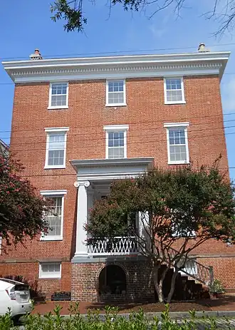Originally constructed in 1845 as a three-bay, Greek Revival brick town house, it consisted of two floors measuring 40'x40' above an English basement, with brick and wood walls, 15 fireplaces, two front parlors, living room and a kitchen outbuilding.[3]