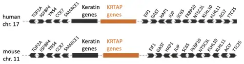 The KRTAP locus on human chromosome 17 includes the following 40 genes (in this order on the chromosome; lower-case "p" indicates pseudogenes): KRTAP3-3, KRTAP3-2, KRTAP3p1, KRTAP3-1, KRTAP1-5, KRTAP1-4, KRTAP1-3, KRTAP1-1, KRTAP2-1, KRTAP2-2, KRTAP2-3, KRTAP2-4, KRTAP4p2, KRTAP4-7, KRTAP4-8, KRTAP4p1, KRTAP4-9, KRTAP4-11, KRTAP4-12, KRTAP4-6, KRTAP4-5, KRTAP4-4, KRTAP4-3, KRTAP4-2, KRTAP4-1, KRTAP4p3, KRTAP9-1, KRTAP9-9, KRTAP9-2, KRTAP9-3, KRTAP9-8, KRTAP9-4, KRTAP9-5, KRTAP9-6, KRTAP9-12 KRTAP9-7, KRTAP9-10, KRTAP29-1, KRTAP16-1, and KRTAP17-1.[1]
