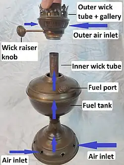 A central-draft lamp is a continuation of the principles used in the Argand lamp from 1780. It also uses a tubular round wick and it also has air intake under the flame into the glass chimney. Since whale oil used in the Argand lamp has a high viscosity it was necessary to place the oil reservoir higher than the flame of the lamp itself in order to let the oil flow by pressure caused by gravity. Kerosene has a much lower viscosity and can be transported through the wick by capillary action. This made it possible to install the oil reservoir below the flame. Oil reservoirs were made with a hollow tube in the middle that transported air from below the oil reservoir into the flame. [14] The tubular woven wick (or flat wick rolled into a tube, the seam of which is then stitched together to form the complete wick) is placed around this tube. The tubular wick is then mounted into a "carrier", which is some form of a toothed rack that engages into the gears of the wick-raising mechanism of the burner and allows the wick to be raised and lowered. The wick rides in between the inner and outer wick tubes; the inner wick tube (central draft tube) provides the "central draft" or draft that supplies air to the flame spreader. When the lamp is lit, the central draft tube supplies air to the flame spreader that spreads out the flame into a ring of fire and allows the lamp to burn cleanly.