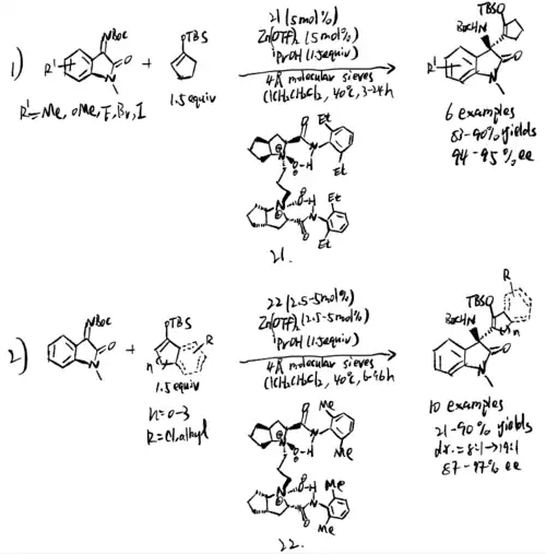 Feng and coworkers used chiral N,N' -dioxide/Zn(II) complexes to catalyze silyl enol ethers and ketimines in 2019.[15] The reaction started with an α-alkenyl addition of silyl enol ethers. Dioxide (compound 21 and 22 in scheme 20) was proved to the best reaction condition for a wide range of isatin-derived ketimines to generate great yield of products with high stereoselectivity. Pyrazolinone-derived ketimines are also found to be suitable substates. The mechanism demonstrates that Mukaiyama–Mannich addition intermediates produced β-amino silyl enol ethers as product.