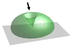 The green volume illustrates visible space limited by the keyhole problem. The arrow points to the "keyhole" as unviewable sky volume.