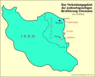 Khorasani Arabs are Iranian Arabs who are descended from the Arabs who immigrated to the Khorasan area of Iran during the Abbasid Caliphate (750−1258). Unlike the Arabs of Iran's Khuzestan Province in the southwestern part of the country, who are direct descendants of more recent 18th century migrants into the area, the Khorasani Arabs are descended from Arab migrants of middle ages.[1] According to a 2013 article in peer-reviewed journal Iran and the Caucasus, the Khorasani Arabs, numbering c. 50,000, are "already almost totally Persianised".[1]