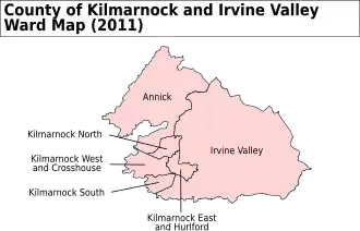 The electoral wards in the Kilmarnock and Irvine Valley constituency are listed below. All of these wards are part of East Ayrshire:[2]