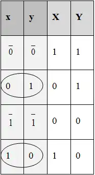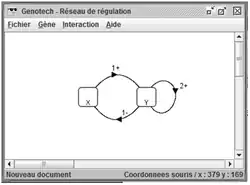 Consider a simple two-element system in which product x activates gene Y and product y represses gene X as shown in figure D. Each variable takes only two values; 0 and 1. In other words,