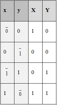 The state table of graph of interactions in figure D is shown in figure G. This table states for each state of the variables (x, y) i.e. present or absent, which products are synthesized and which are not synthesized at a significant rate. Consider the state 00/10, in which both of the gene products are absent but gene X is on. As product x is absent but being synthesized so it can be expected that in near future it will be present and the logical value of x will change from 0 to 1. This can be described by the notation Ō, in which the dash above the digit is due to the fact that variable x is committed to change its value from 0 to 1. Generally, a dash over the figure representing the logical value of a variable each time this value is different from that of the corresponding function. The state just considered can thus be represented as ŌO.